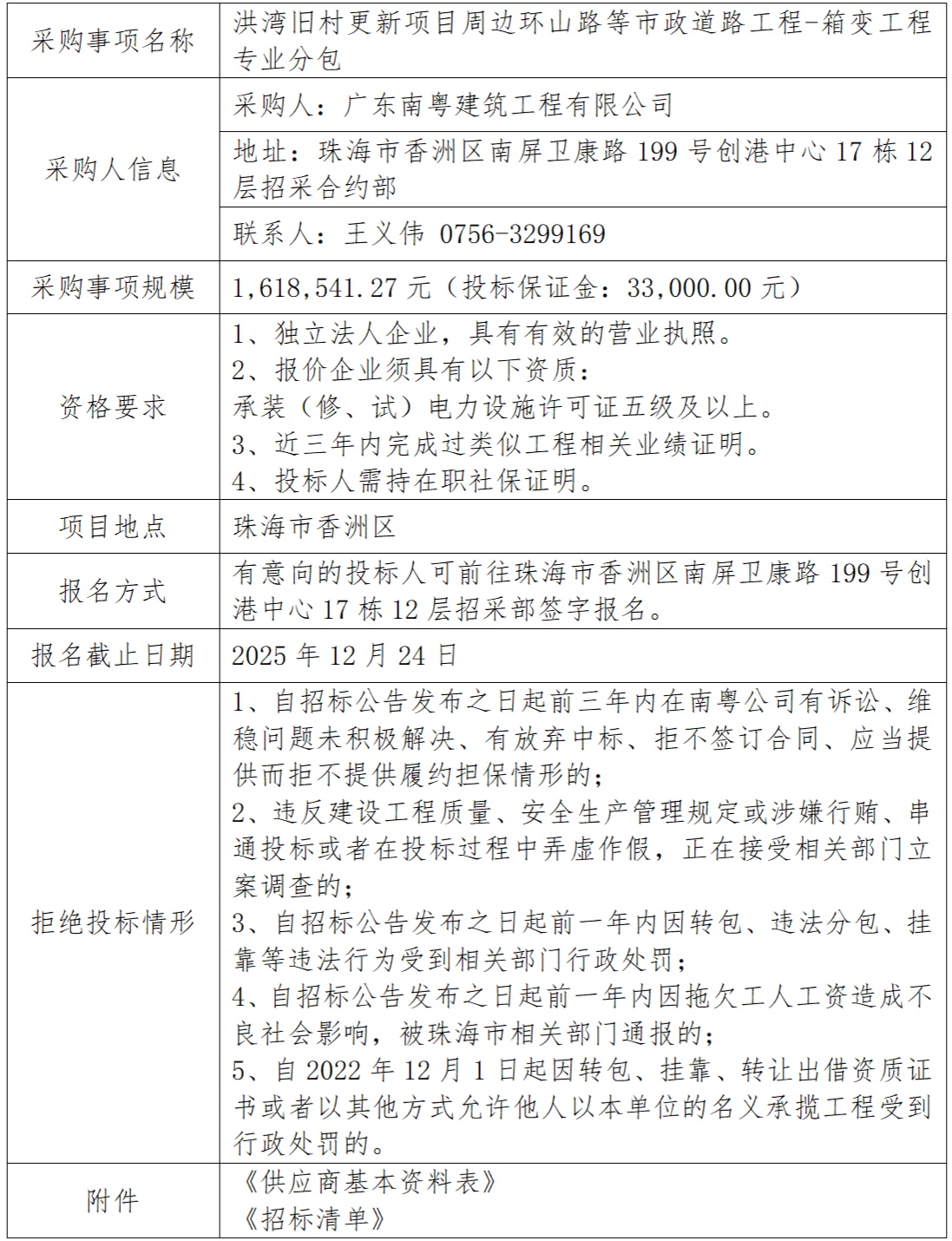 洪灣舊村更新項(xiàng)目周邊環(huán)山路等市政道路工程-箱變工程專業(yè)分包 專欄:工程招標(biāo) 發(fā)布日期: 2025-12-19 作者:招采管理中心 附件:供應(yīng)商基本資料表 附件:洪灣舊村更新項(xiàng)目周邊環(huán)山路等市政道路工程-箱變工程專業(yè)分包招標(biāo)清單 返回列表 上一篇:廣昌保障房配套基礎(chǔ)設(shè)施項(xiàng)目施工總承包--交通、安監(jiān)工程專業(yè)分包 下一篇:廣昌保障房配套基礎(chǔ)設(shè)施項(xiàng)目施工總承包-預(yù)制水泥類材料采購招標(biāo)