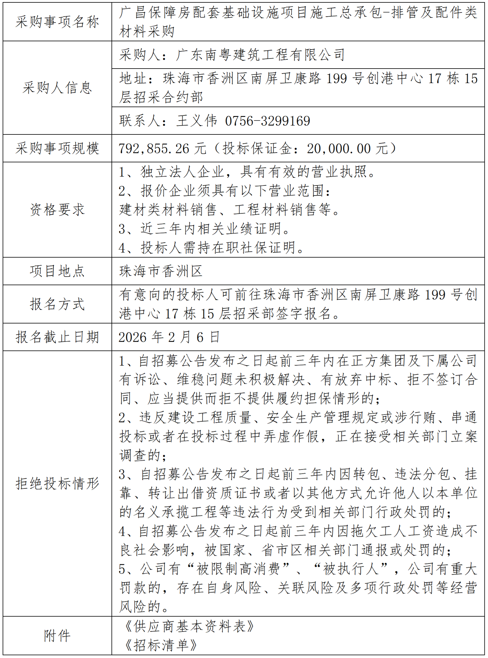 廣昌保障房配套基礎(chǔ)設(shè)施項(xiàng)目施工總承包-排管及配件類材料采購(gòu) 專欄:工程招標(biāo) 發(fā)布日期: 2026-02-04 作者:招采管理中心 附件:供應(yīng)商基本資料表 附件:廣昌保障房配套基礎(chǔ)設(shè)施項(xiàng)目施工總承包-排管及配件類材料采購(gòu)招標(biāo)清單 返回列表 上一篇:珠海市香洲區(qū)中小學(xué)、幼兒園辦學(xué)場(chǎng)所及停車場(chǎng)改造提升工程項(xiàng)目施工總承包-廣昌小學(xué)臨建工程專業(yè)分包 下一篇:廣昌保障房配套基礎(chǔ)設(shè)施項(xiàng)目施工總承包-預(yù)制水泥類材料采購(gòu)招標(biāo)(預(yù)算變更)
