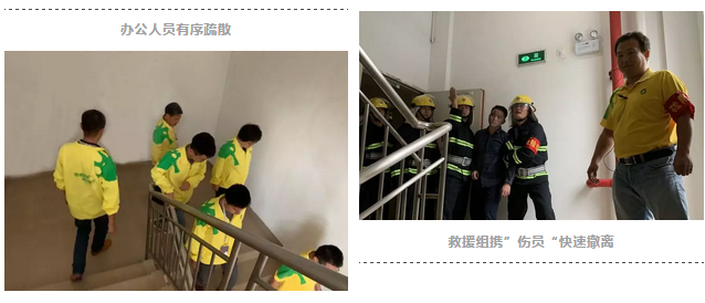 15:15時,聽到模擬消防疏散信號后,各樓層參加疏散的人員紛紛拿起消防毛巾捂住口鼻,在工作人員的指引下井然有序地沿大樓疏散通道到達指定位置,同時撥打119火警電話。巡查員現(xiàn)場查看并找到火災發(fā)生點,應急搶險組、救護組按照分工迅速展開救援。