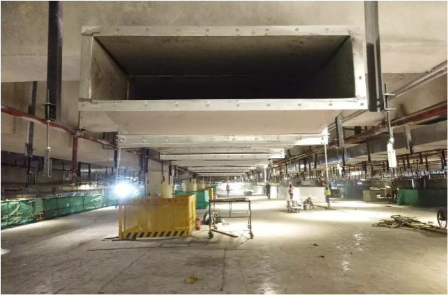 地下通道環(huán)境密閉,且原有通風(fēng)設(shè)施已完全癱瘓,汽車尾氣、施工廢氣等氣體難以排出,施工環(huán)境平均溫度比地面高5到6攝氏度。但這些并沒有阻礙工程進(jìn)度,為保障施工人員安全,香洲正方設(shè)置了12臺排風(fēng)機(jī),排出通道中的廢氣。同時,采用已經(jīng)焊接完成的施工平臺部件,減少因組裝產(chǎn)生的廢氣。