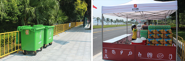 10時,情侶南路所有的手繪垃圾桶已全部被拆除移走,取而代之的是臨時增設的600L大型垃圾桶。烈日下,劉德龍和同事們奔走在7個便民售水服務店之間,搭建帳篷、配送銷售物料。