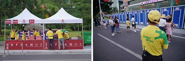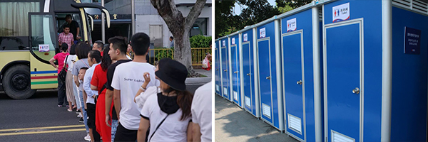 12時,2臺車輛式移動洗手間及100個立式移動洗手間停放到指定位置,所有指示牌完成擺放……