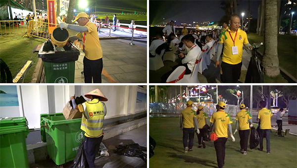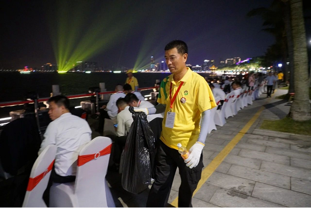 21時,絢爛的焰火晚會在數(shù)萬人的歡呼聲中落下帷幕,“小黃人”們組織觀眾有序退場。人群散去,“小黃人”們還不能回去,大家開始對各自負責區(qū)域進行全面清潔,采取一字排開的方式展開掃蕩式垃圾清理、撤回臨時垃圾桶及洗手間,完成路面保潔,以確保當晚還市民一條清潔美麗的情侶路……