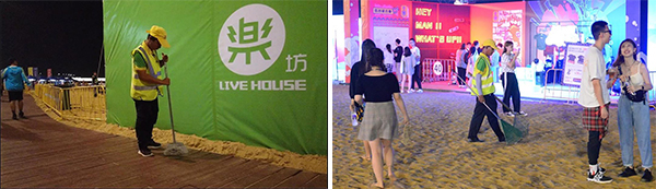 音樂節(jié)人氣爆棚,上萬(wàn)觀眾匯聚狂歡。城市客廳箴言廣場(chǎng)、木棧道上卻十分潔凈。為了防止沙子漂上木棧道,影響觀眾行走,木棧道上每隔30米就設(shè)有一名專門的保潔員清理沙粒。