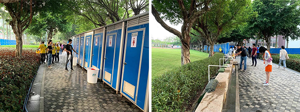 除園區(qū)本身的廁所開放,現(xiàn)場(chǎng)還增加了20個(gè)臨時(shí)廁所并加裝水龍頭,方便觀眾洗手。專門的清潔人員使用空氣清新劑祛除異味,保持紙巾充足。