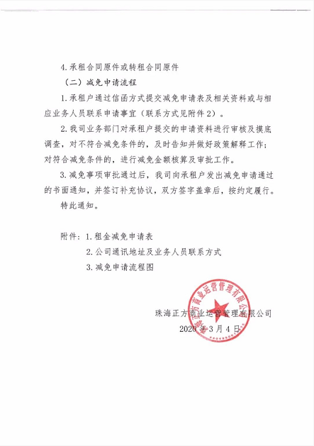 3.減免事項(xiàng)審批通過后,我司向承租戶發(fā)出減免申請通過的書面通知,并簽訂補(bǔ)充協(xié)議,雙方簽字蓋章后,按約定履行。