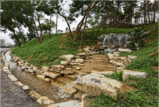針對(duì)公園內(nèi)原有的幾處地質(zhì)災(zāi)害點(diǎn)制定修復(fù)方案,在保證工程安全的前提下,進(jìn)行邊坡的修復(fù)處理,采用植物軟化過渡,使得山間景觀更加親近,游人也更能融入大自然。