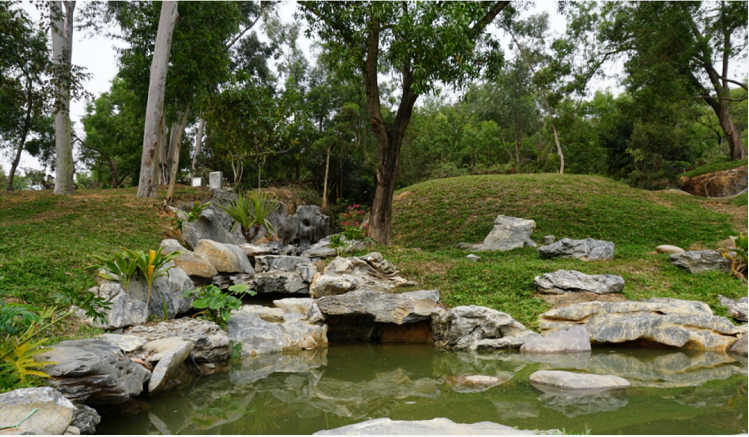 保留原有芭蕉林、楊桃林、松林、荔枝林、竹林帶等原生植被,做到“無砍伐、無新種”,降低造景成本,節(jié)約養(yǎng)護(hù)費(fèi)用。沿原有登山路線順道而設(shè)松林步道,并利用原有樹木枯枝,打造步道與荷花池欄桿。