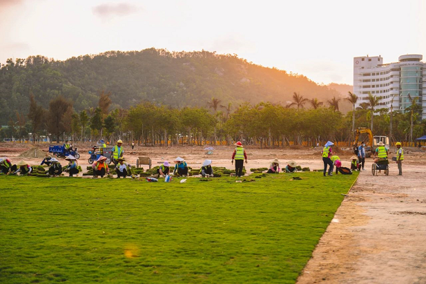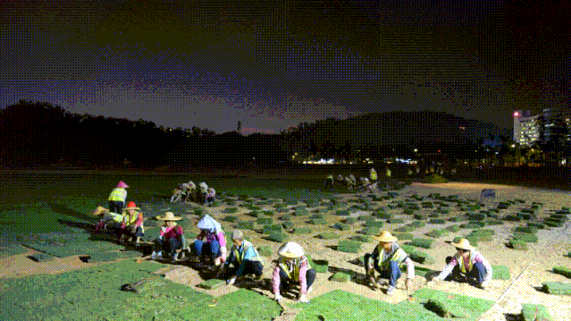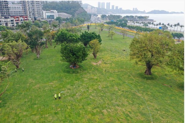 目前,海天公園管養(yǎng)提升項目進度已完成75%,各種機械正在如火如荼運轉(zhuǎn),各項工作正在快速有序推進。其中,公園東部靠海天驛站一側(cè)已完成臺灣草草坪鋪設(shè),呈現(xiàn)出碧草茵茵的風貌。在中央大草坪的鋪設(shè)現(xiàn)場,只見百余工人正在快速鋪草、壓土,一會功夫一塊平整無縫的新草坪就呈現(xiàn)在眾人眼前。