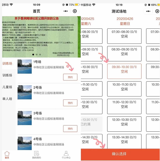 返回主頁(yè)面,共有18個(gè)網(wǎng)球場(chǎng)地可供選擇;點(diǎn)擊球場(chǎng)右邊的【預(yù)約】,進(jìn)入空余球場(chǎng)預(yù)約頁(yè)面,選擇球場(chǎng);點(diǎn)擊【確認(rèn)選擇】。