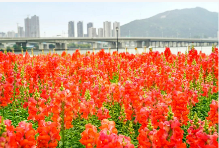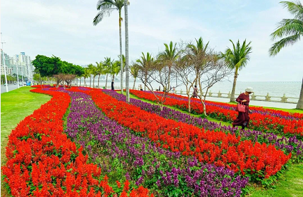 春光燦爛,如詩(shī)如畫(huà),一串紅、一串紫、醉碟、三色瑾、孔雀草、波斯菊,裝點(diǎn)在情侶路這條碧綠絲帶上。