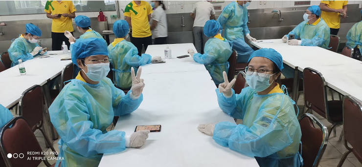 感謝你們披上藍色防護服,不顧防護面罩、防護服的悶與熱。從額角掉落的汗水,被浸濕的小黃衣,從早到晚12個小時的默默奉獻。即使身軀疲憊,卻始終堅守崗位。