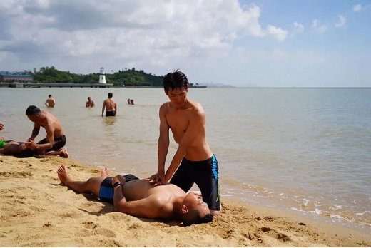 海濱泳場模擬臺風(fēng)登陸時,在泳場開展溺水人員營救、心肺復(fù)蘇等實戰(zhàn)演練,切實提高應(yīng)急搶險隊伍的綜合作戰(zhàn)能力。