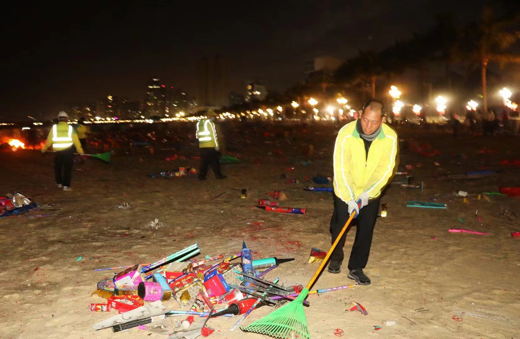 本次煙花燃放清理工作的難點(diǎn)區(qū)域是海天公園沙灘。大型煙花燃放后,大量的碎屑會隱藏在沙子里。為此,保潔清理隊伍分條塊對海灘進(jìn)行仔細(xì)梳理清潔,靠人力一點(diǎn)點(diǎn)撿拾,將沙子里混雜的煙花爆竹碎屑梳理出來,然后用拖運(yùn)車轉(zhuǎn)運(yùn)至集中存放點(diǎn)。