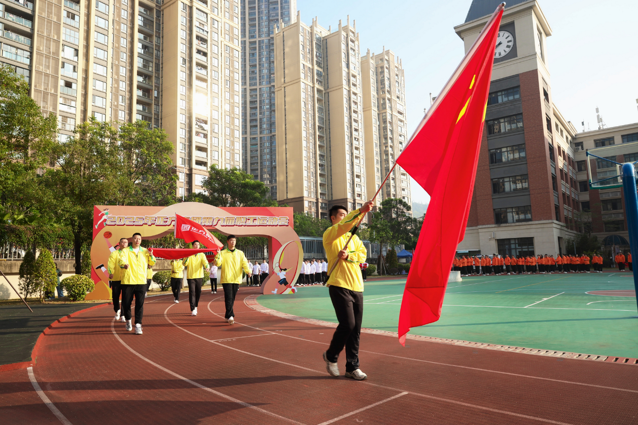 運(yùn)動(dòng)會(huì)在激昂的旋律中拉開帷幕。護(hù)旗手們氣宇軒昂、步伐鏗鏘,莊嚴(yán)護(hù)送五星紅旗前行,彰顯正方人昂揚(yáng)向上的精神風(fēng)貌。