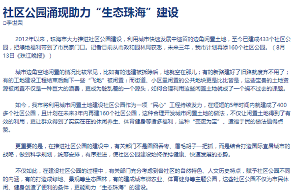 珠海特區(qū)報(bào):社區(qū)公園涌現(xiàn)助力“生態(tài)珠海”建設(shè) 2017-08-15 珠海特區(qū)報(bào):社區(qū)公園涌現(xiàn)助力“生態(tài)珠?!苯ㄔO(shè) 返回列表 上一篇:珠江晚報(bào):把綠地福利帶到市民家門口未來三年珠海再添160個(gè)社區(qū)公園 下一篇:珠海特區(qū)報(bào):社區(qū)公園好玩嗎?未來三年珠海將再添160個(gè)社區(qū)公園