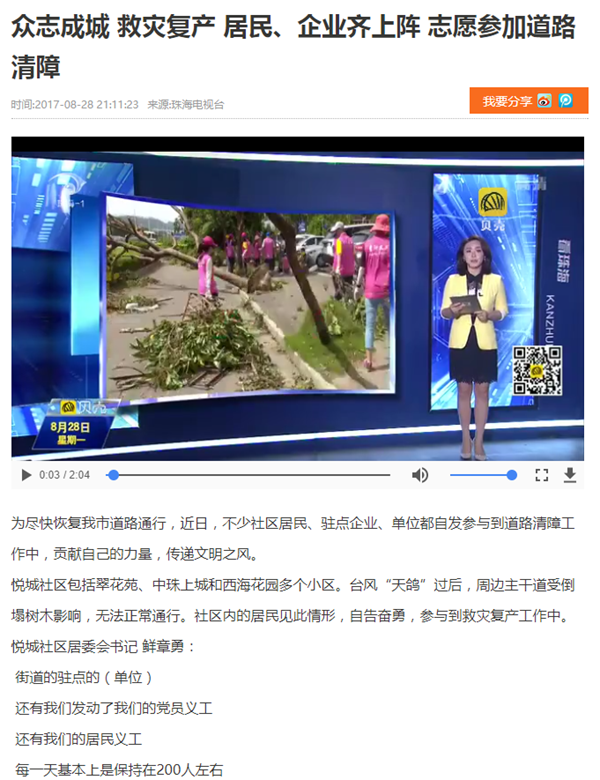 珠海網(wǎng):眾志成城 救災(zāi)復(fù)產(chǎn) 居民、企業(yè)齊上陣 志愿參加道路清障 2017-08-28 珠海網(wǎng):眾志成城 救災(zāi)復(fù)產(chǎn) 居民、企業(yè)齊上陣 志愿參加道路清障 返回列表 上一篇:珠海網(wǎng):黨員走在前 全民齊參與 近3000人參與情侶路清障保潔 某海防旅支援我市救災(zāi) 下一篇:珠海新聞網(wǎng):家門口就有綠地 未來三年將再添160個(gè)社區(qū)公園