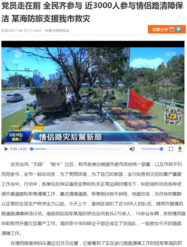 珠海網(wǎng):黨員走在前 全民齊參與 近3000人參與情侶路清障保潔 某海防旅支援我市救災 2017-08-29 珠海網(wǎng):黨員走在前 全民齊參與 近3000人參與情侶路清障保潔 某海防旅支援我市救災 返回列表 上一篇:珠海網(wǎng):園林企業(yè)自發(fā)救樹 連根拔起的大樹能救活!成活率80%以上! 下一篇:珠海網(wǎng):眾志成城 救災復產(chǎn) 居民、企業(yè)齊上陣 志愿參加道路清障