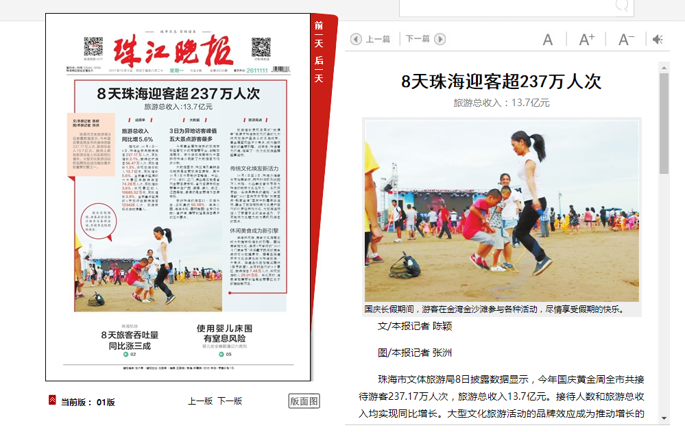 珠海市文體旅游局8日披露數(shù)據(jù)顯示,今年國慶黃金周全市共接待游客237.17萬人次,旅游總收入13.7億元。接待人數(shù)和旅游總收入均實現(xiàn)同比增長。大型文化旅游活動的品牌效應(yīng)成為推動增長的重要引擎之一。