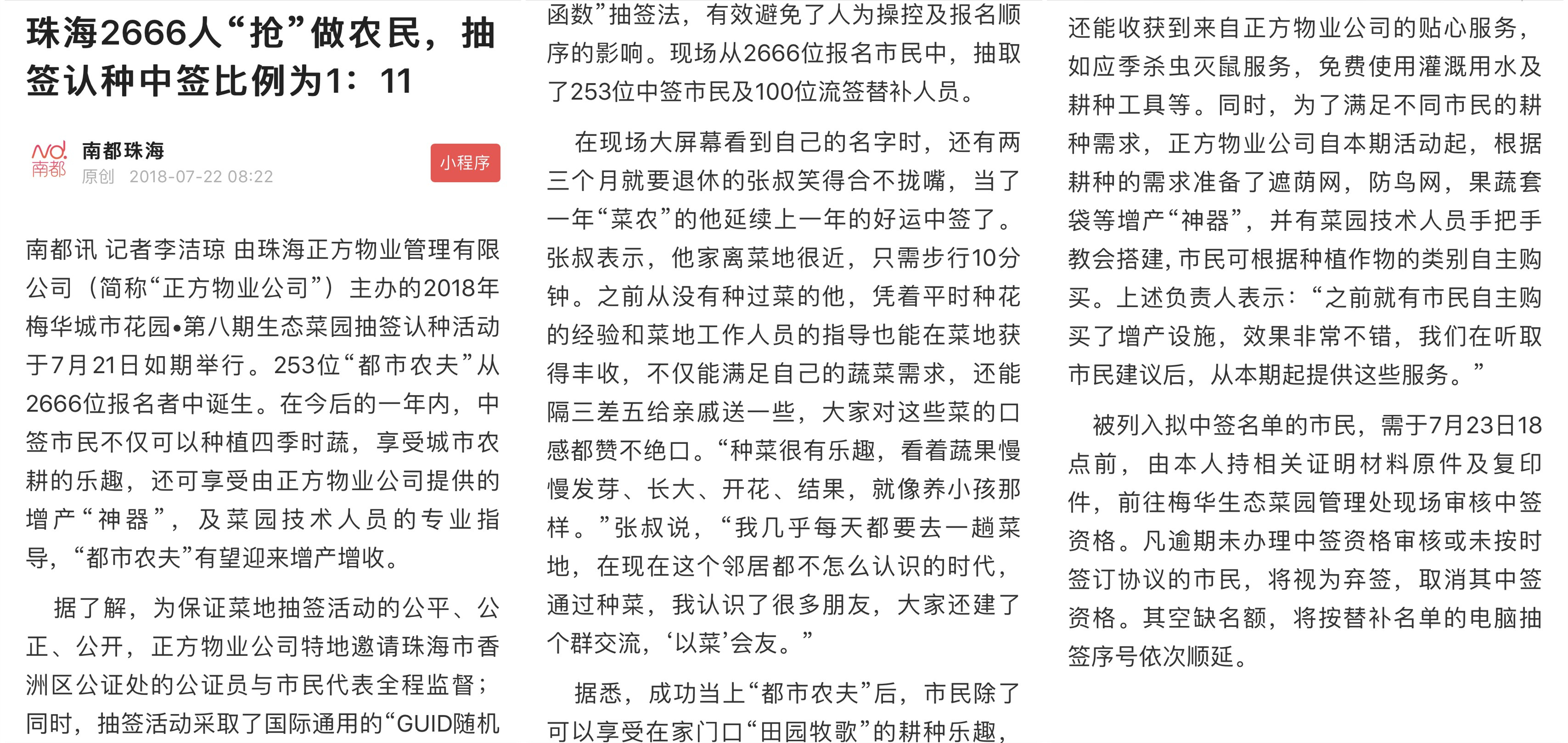 據(jù)了解,為保證菜地抽簽活動(dòng)的公平、公正、公開,正方物業(yè)公司特地邀請(qǐng)珠海市香洲區(qū)公證處的公證員與市民代表全程監(jiān)督;同時(shí),抽簽活動(dòng)采取了國(guó)際通用的“GUID隨機(jī)函數(shù)”抽簽法,有效避免了人為操控及報(bào)名順序的影響?,F(xiàn)場(chǎng)從2666位報(bào)名市民中,抽取了253位中簽市民及100位流簽替補(bǔ)人員。