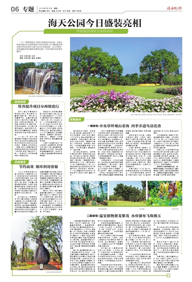 據(jù)統(tǒng)計,海天公園內植被非常豐富,有超過185個品種的植物,超過4200棵樹木,其中1800多棵樹木是公園內原有的,通過歸類移植的方法,讓它們更加整齊有序。“有2400多棵樹木是從園林中心、農科中心、原金鼎豬場、正方苗圃等地移植,讓散落在市區(qū)各處的樹木,為海天公園增添一抹亮色?!睆埼膸r說。
