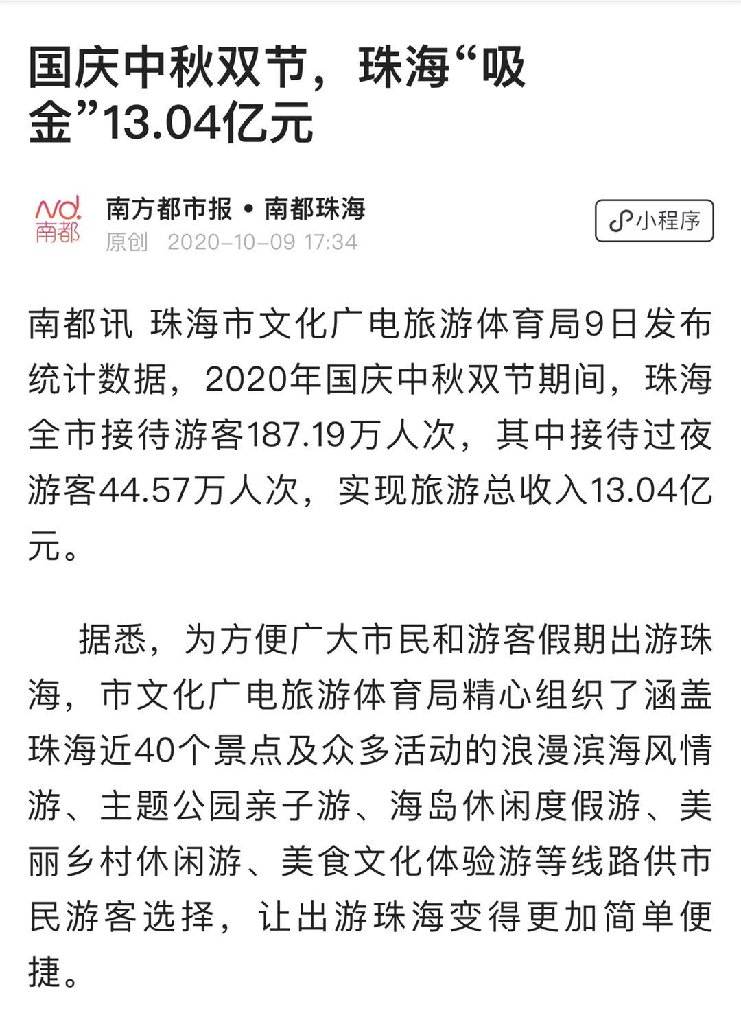 珠海市文化廣電旅游體育局9日發(fā)布統(tǒng)計(jì)數(shù)據(jù),2020年國(guó)慶中秋雙節(jié)期間,珠海全市接待游客187.19萬(wàn)人次,其中接待過夜游客44.57萬(wàn)人次,實(shí)現(xiàn)旅游總收入13.04億元。
