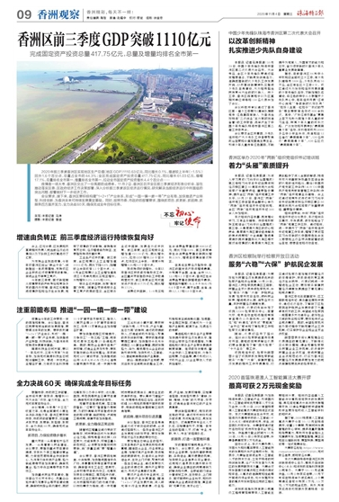 2020年前三季度香洲區(qū)實現(xiàn)地區(qū)生產(chǎn)總值(地區(qū)GDP)1110.63億元,同比增長0.1%,增速較上半年(-1.5%)回升1.6個百分點,總量占全市的44.3%;全區(qū)完成固定資產(chǎn)投資總量417.75億元,同比增長61.03億元,增幅17.1%,總量排名全市第一,增量排名全市第一,拉動全市固定資產(chǎn)投資增長4.4個百分點……