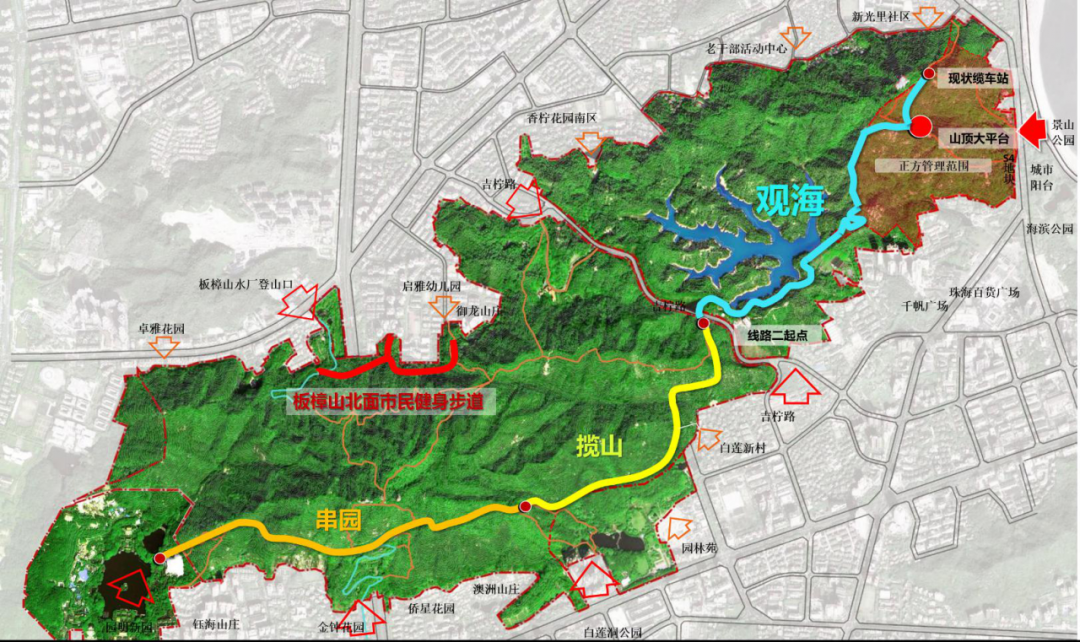 板樟山山地步道沿板樟山南面山腰而建,全線長8553米。根據(jù)不同風(fēng)景特色分為串園、攬山、觀海三個主題段,自西向東串聯(lián)起圓明新園、澳門回歸公園、白蓮洞公園、吉大水庫、景山公園,直至城市陽臺,打造通山、達(dá)海、串園的無障礙特色山地步道。