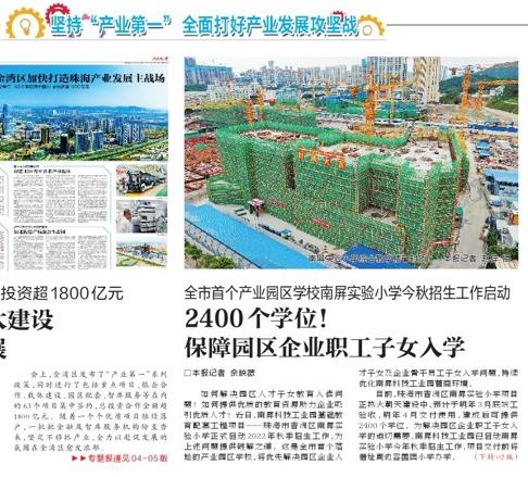 目前,珠海市香洲區(qū)南屏實驗小學(xué)項目正熱火朝天建設(shè)中,預(yù)計于明年3月底竣工驗收,明年4月交付使用,建成后可提供2400個學(xué)位。為解決園區(qū)企業(yè)職工子女入學(xué)的迫切需要,南屏科技工業(yè)園已啟動南屏實驗小學(xué)今年秋季招生工作,項目交付前將借址周邊容國團(tuán)小學(xué)辦學(xué)。(下轉(zhuǎn)02版) (上接01版)