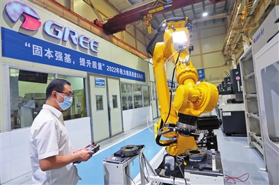 格力電器精密模具車間,技術(shù)人員在調(diào)試格力機(jī)器人。