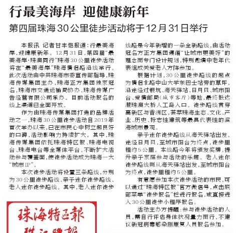 本報訊 記者甘豐愷報道:行最美海岸,迎健康新年。12月31日,第四屆“最美海岸·珠澳同行”珠海30公里徒步活動將在“最美海岸”珠海情侶路沿線舉行。此次活動由中共珠海市委宣傳部指導(dǎo),珠海傳媒集團(tuán)主辦,珠海正方集團(tuán)獨(dú)家冠名,珠海市交通運(yùn)輸局協(xié)辦,珠海傳媒廣告經(jīng)營有限公司承辦。目前活動報名的線上渠道已全面開放。