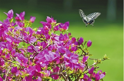 恰好是珠海短暫而美好的秋景,在一城、一園中完整而盛大地展現(xiàn)。沐浴在秋日的陽(yáng)光里,高矮灌木錯(cuò)落有致,五彩花卉爭(zhēng)奇斗艷,久居家中的市民在園中小徑悠閑漫步,健身器材上老者踢腿扭腰。這一片生機(jī)之中,成群結(jié)隊(duì)翩翩飛舞的蝴蝶,最為吸引目光。