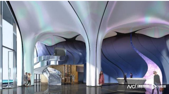 △大堂及大堂吧以海邊“天幕”為靈感,讓極具活力的海邊“天幕”融合海岸線的張力,營造出極具生命力的舒適樂享空間。全海景的酒店建筑呈現(xiàn)出流暢自由的弧形結(jié)構(gòu),運用金屬、玻璃等不同材質(zhì)構(gòu)建出了極具未來感的風格立面,與相鄰的海洋館遙相呼應。