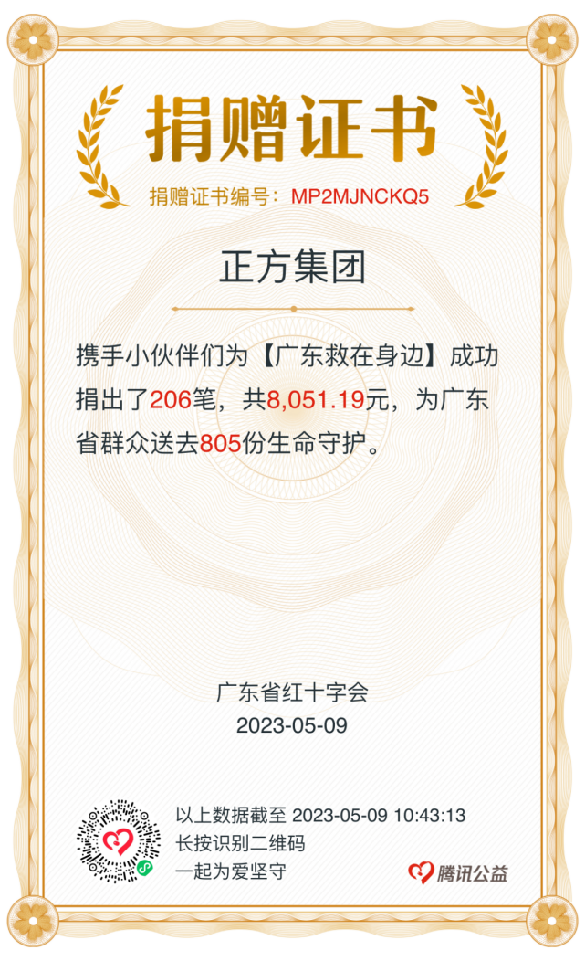 自5月7日起,公司累計(jì)發(fā)動(dòng)206名職工參與籌款活動(dòng),截至5月9日,正方集團(tuán)共籌款8051.19元,為廣東省群眾送去805份生命守護(hù),在“香洲守護(hù) 救在身邊”公益線上眾籌項(xiàng)目中排名第四。