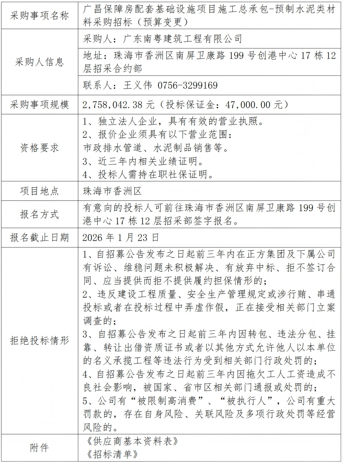 廣昌保障房配套基礎(chǔ)設(shè)施項(xiàng)目施工總承包-預(yù)制水泥類材料采購(gòu)招標(biāo)(預(yù)算變更) 專欄:工程招標(biāo) 發(fā)布日期: 2026-01-20 作者:招采管理中心 附件:供應(yīng)商基本資料表 附件:廣昌保障房配套基礎(chǔ)設(shè)施項(xiàng)目施工總承包-預(yù)制水泥類材料采購(gòu)招標(biāo)清單 返回列表 上一篇:廣昌保障房配套基礎(chǔ)設(shè)施項(xiàng)目施工總承包-排管及配件類材料采購(gòu) 下一篇:廣昌保障房配套基礎(chǔ)設(shè)施項(xiàng)目施工總承包-模板材料采購(gòu)(延期公示)