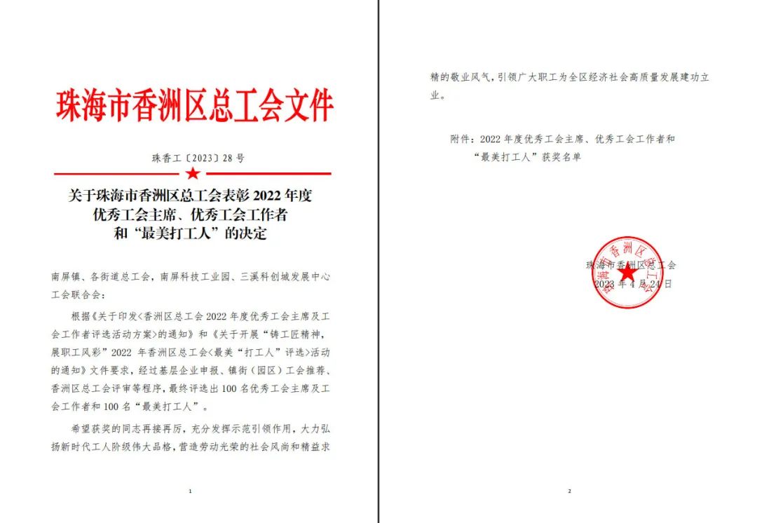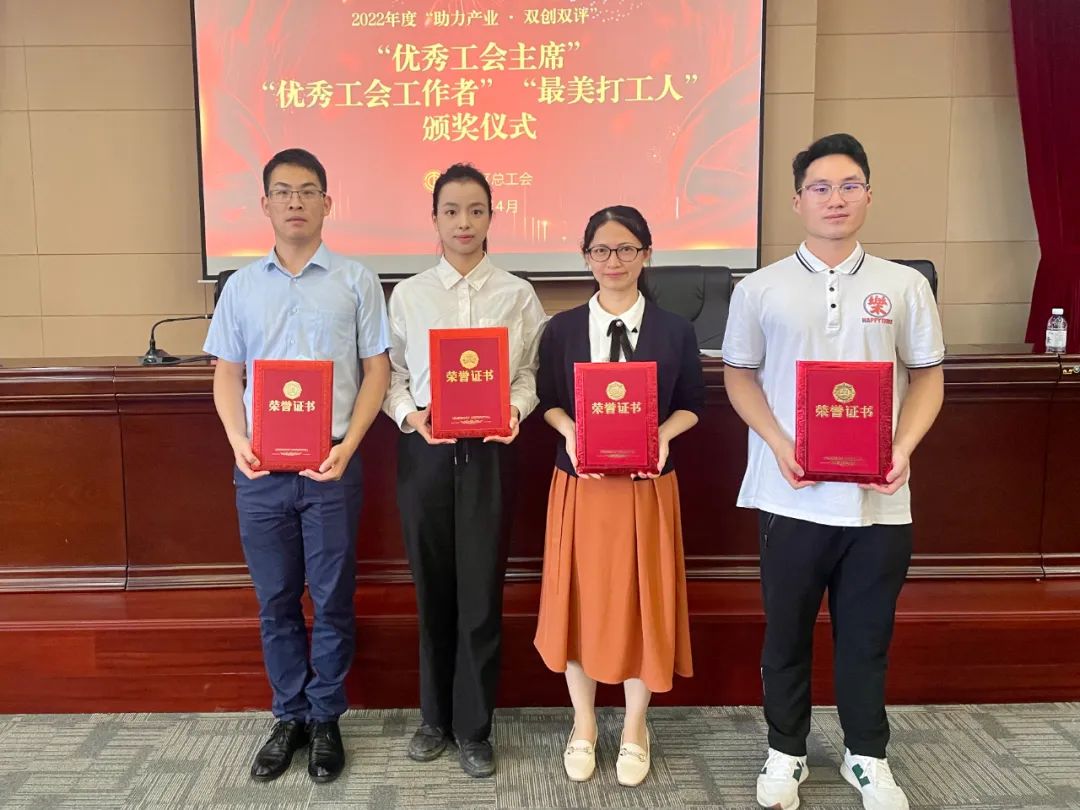 為貫徹落實黨的二十大和習(xí)近平總書記在廣東考察時的重要講話精神,緊扣珠海市“產(chǎn)業(yè)第一”工作總抓手,扎實推進產(chǎn)業(yè)工人隊伍建設(shè)改革,引領(lǐng)廣大職工為全區(qū)經(jīng)濟社會高質(zhì)量發(fā)展建功立業(yè)。4月28日香洲區(qū)總工會對 2022年度“助力產(chǎn)業(yè)·雙創(chuàng)雙評”系列活動中獲評“優(yōu)秀工會主席”、“優(yōu)秀工會工作者”和“最美打工人”的個人進行頒獎。正方集團獲獎職工代表參與頒獎儀式。