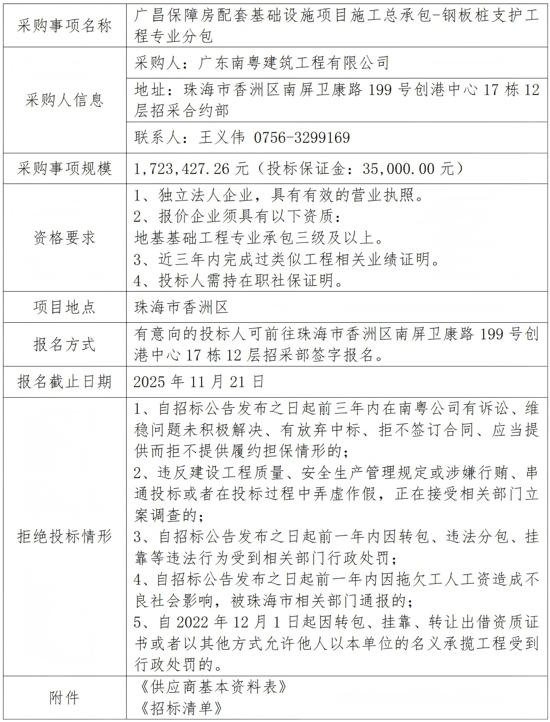 廣昌保障房配套基礎(chǔ)設(shè)施項(xiàng)目施工總承包-鋼板樁支護(hù)工程專業(yè)分包 專欄:工程招標(biāo) 發(fā)布日期: 2025-11-19 作者:招采管理中心 附件:供應(yīng)商基本資料表 附件:廣昌保障房配套基礎(chǔ)設(shè)施項(xiàng)目施工總承包-鋼板樁支護(hù)工程專業(yè)分包招標(biāo)清單 返回列表 上一篇:2025年財(cái)務(wù)審計(jì)服務(wù)采購(gòu) 下一篇:廣昌保障房配套基礎(chǔ)設(shè)施項(xiàng)目施工總承包--軟基處理工程專業(yè)分包(施工技術(shù)要求調(diào)整)