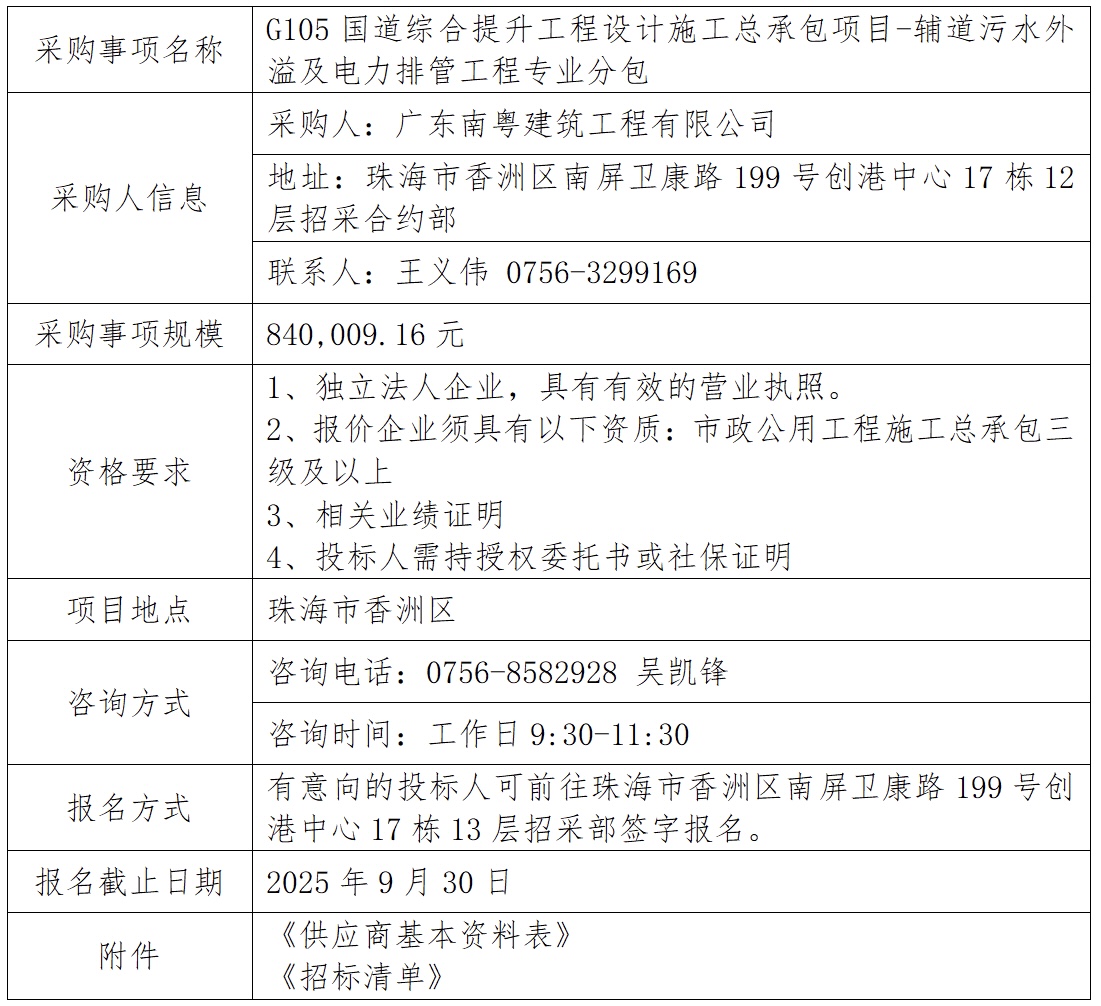 G105國(guó)道綜合提升工程設(shè)計(jì)施工總承包項(xiàng)目-輔道污水外溢及電力排管工程專業(yè)分包 專欄:工程招標(biāo) 發(fā)布日期: 2025-09-25 作者:招采管理中心 附件:供應(yīng)商基本資料表 附件:G105國(guó)道綜合提升工程設(shè)計(jì)施工總承包項(xiàng)目-輔道污水外溢及電力排管工程專業(yè)分包-招標(biāo)清單 返回列表 上一篇:鳳凰山山地步道項(xiàng)目(香山湖公園至海天公園段)-全線整改、維修工程專業(yè)分包 下一篇:三溪科創(chuàng)小鎮(zhèn)二期道路-智慧路燈照明工程整改移交專業(yè)分包(延期公示)