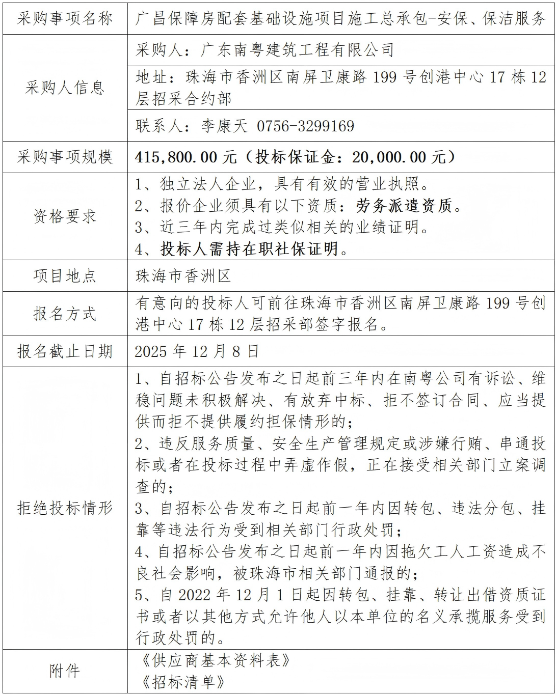 廣昌保障房配套基礎設施項目施工總承包-安保、保潔服務 專欄:工程招標 發(fā)布日期: 2025-12-02 作者:招采管理中心 附件:供應商基本資料表 附件:廣昌保障房配套基礎設施項目施工總承包-安保、保潔服務- 空白清單 返回列表 上一篇:廣昌保障房配套基礎設施項目施工總承包--土建勞務分包(均昌路+廣灣街) 下一篇:廣昌保障房配套基礎設施項目施工總承包-食堂服務