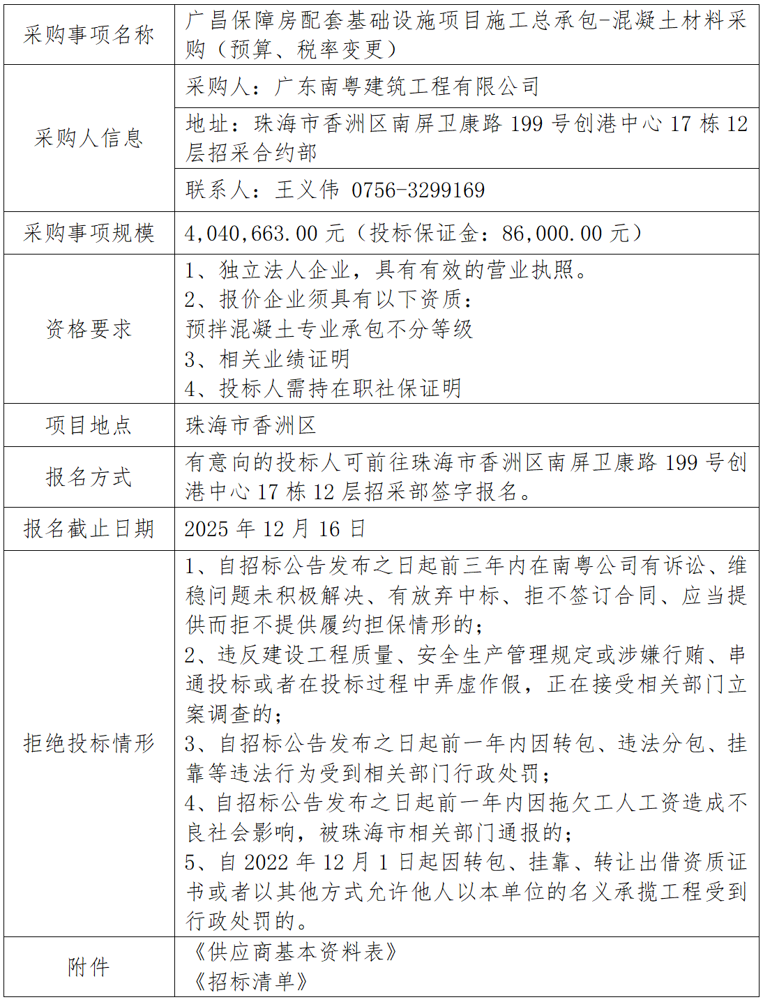 廣昌保障房配套基礎設施項目施工總承包-混凝土材料采購(預算、稅率變更) 專欄:工程招標 發(fā)布日期: 2025-12-11 作者:招采管理中心 附件:供應商基本資料表 附件:廣昌保障房配套基礎設施項目施工總承包-混凝土材料采購招標清單 返回列表 上一篇:仁恒星園-翠前路交翠峰路遷移交通信號燈項目 下一篇:廣昌保障房配套基礎設施項目施工總承包-地材材料采購招標(延期掛網(wǎng))